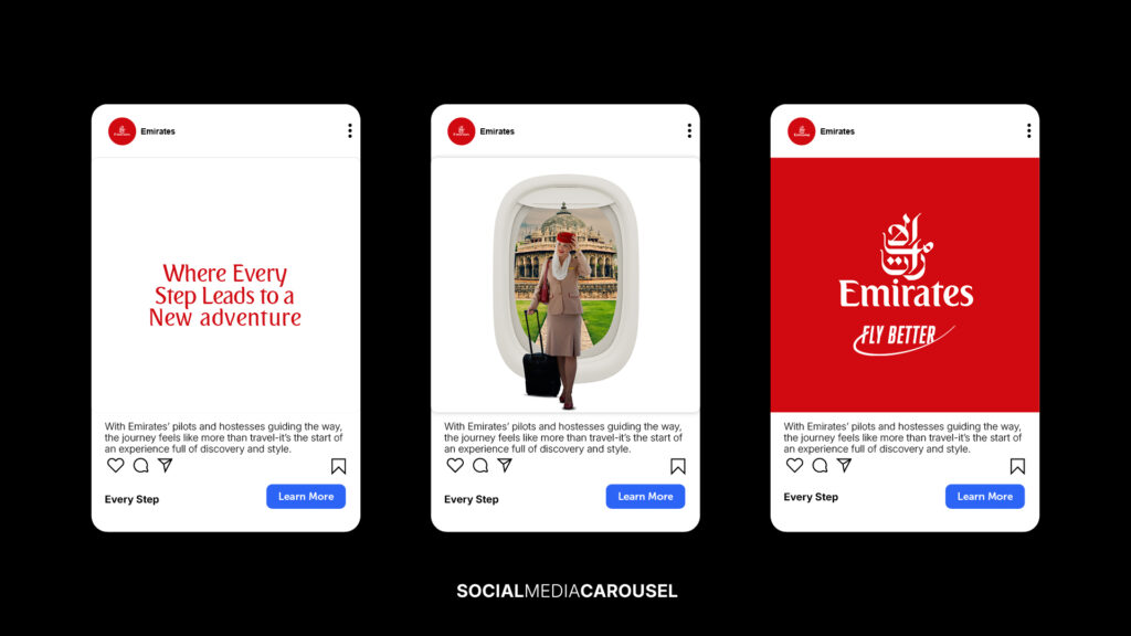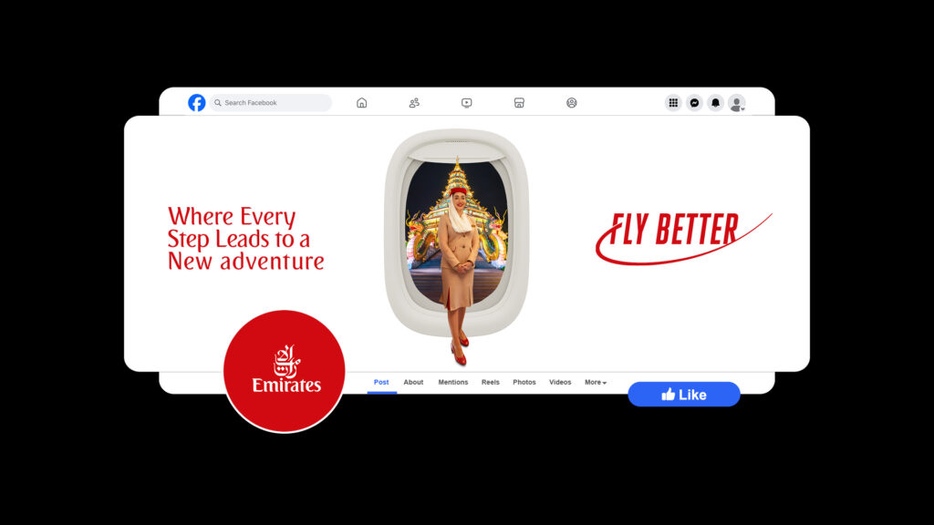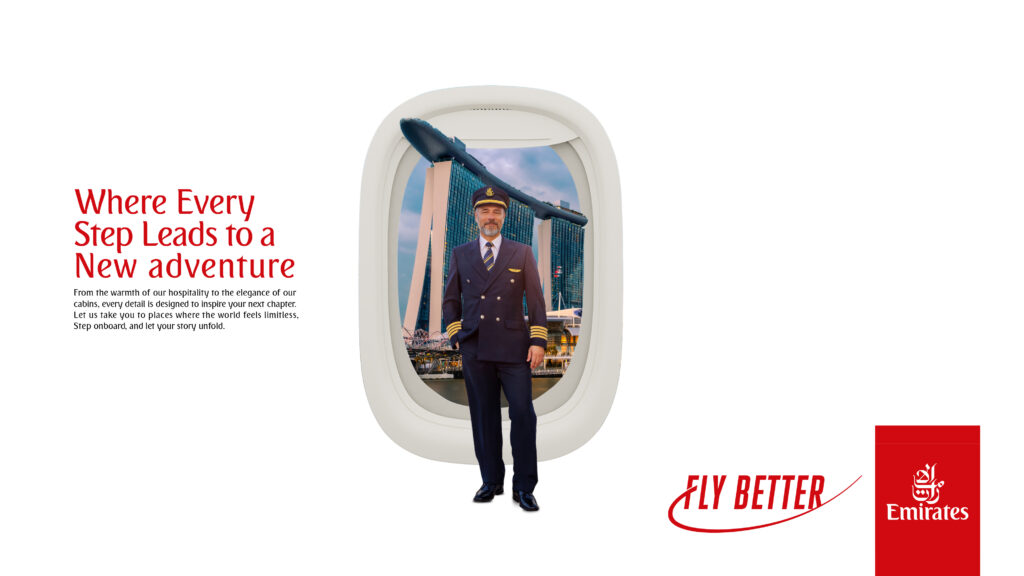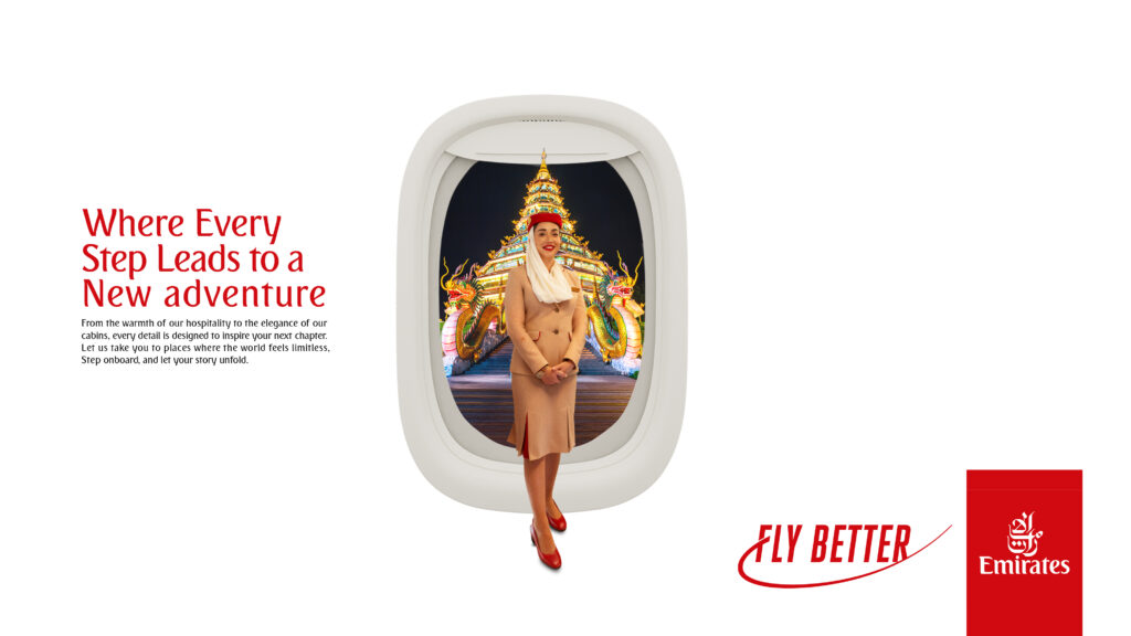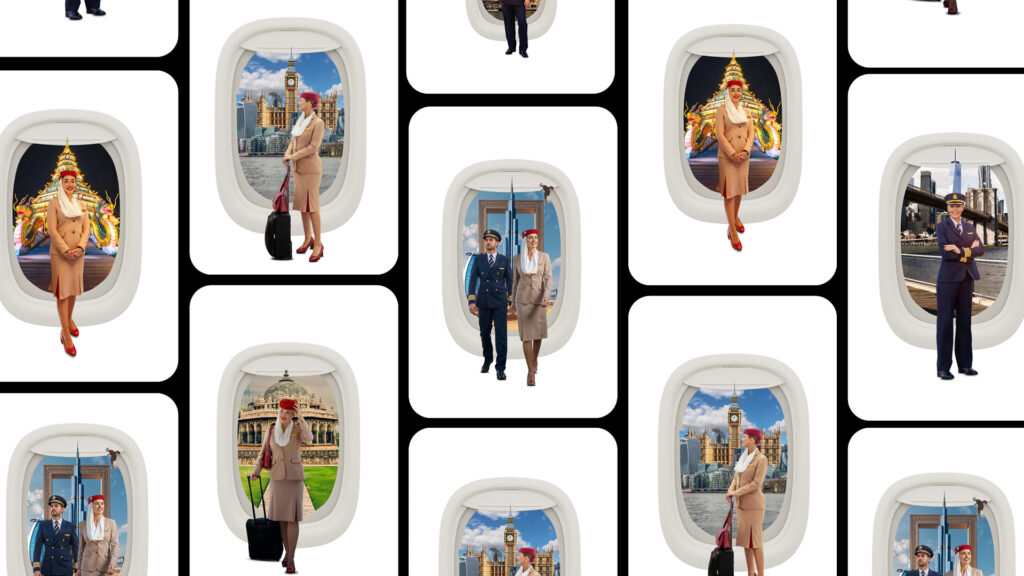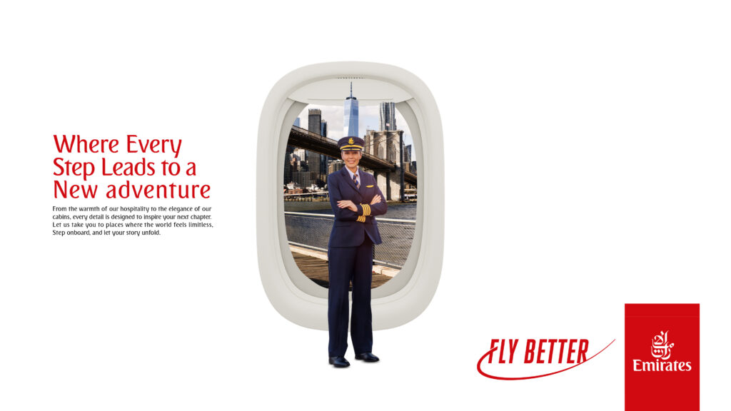 Using an aeroplane window as a portal, showing passengers ready for a new adventure. Emirates’ stylish hostesses and pilots stand by, ready to guide them on their journey, bringing to life the idea that air travel isn’t just transport—it’s the start of a personal adventure, full of discovery and premium experiences.